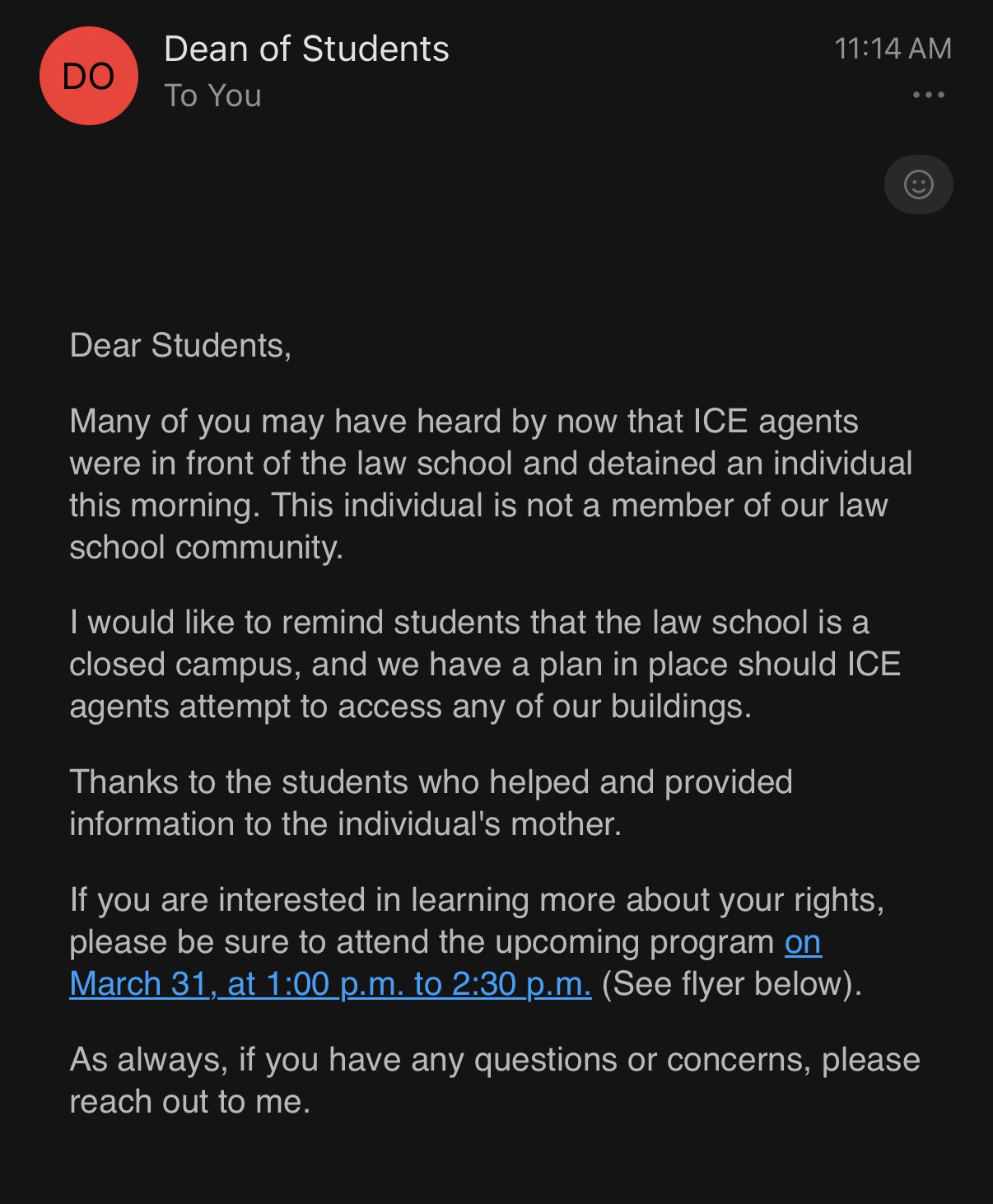 I would like to remind students that the law school is a closed campus, and we have a plan in place should ICE agents attempt to access any of our buildings.