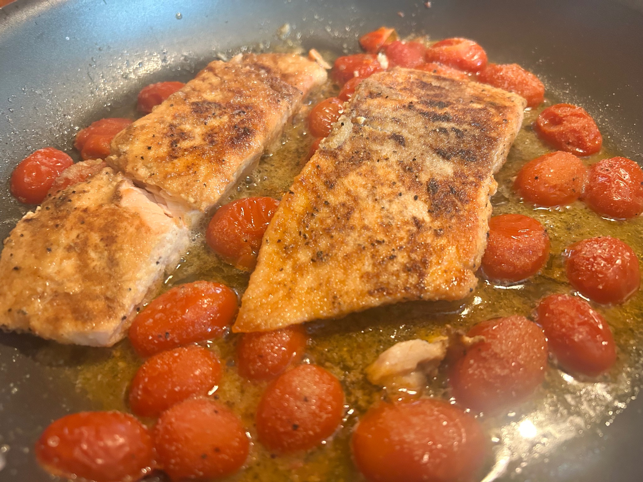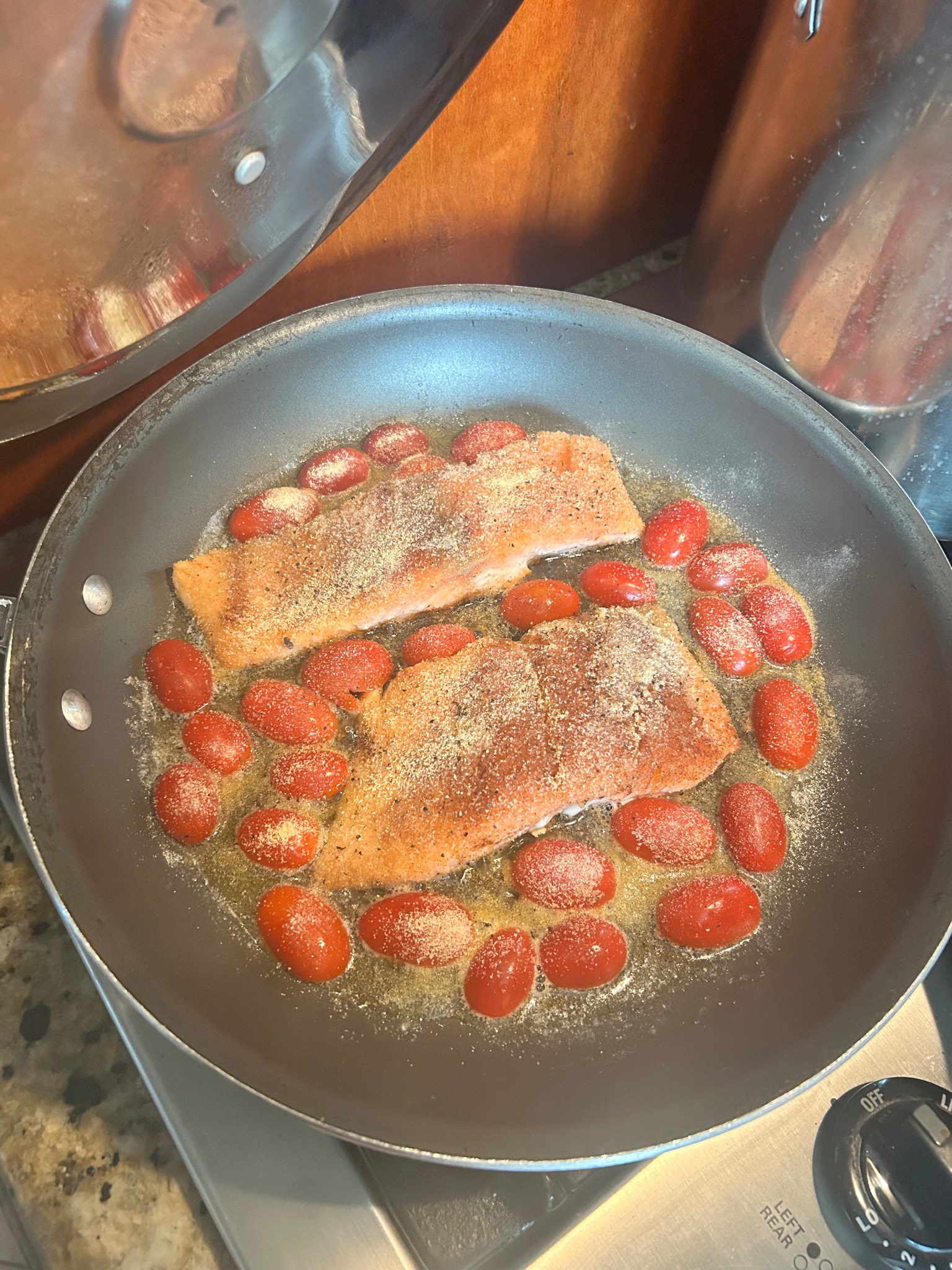 Let roughly six ounces of cherry tomatoes cook with the salmon. Add a little salt, pepper, onion and garlic powder to season them. Don’t worry about getting some of your salmon, it’s only going to add more flavor. You might be wondering why I’m cooking my tomatoes with the salmon and not in a separate pan, but I find that cooking them together adds more flavor to both. You can absolutely cook them in a separate pan since they’re going into the pasta, not with the salmon.