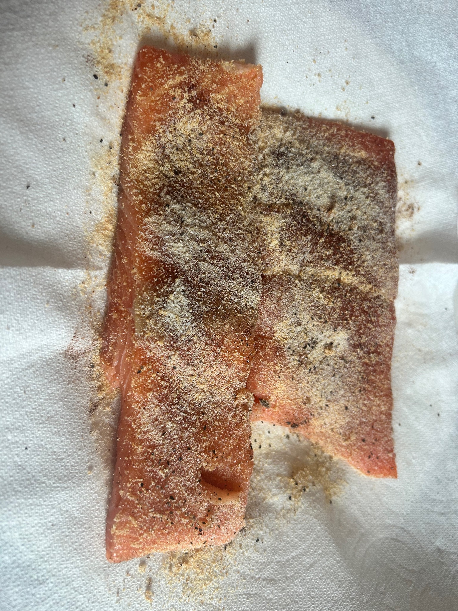 Finishing off our prep, it’s time to get your salmon patties. I purposely buy the patties with the salmon skin already removed to remove the step of removing the skin. Grab your onion powder, garlic powder, cajun seasoning, salt and pepper.