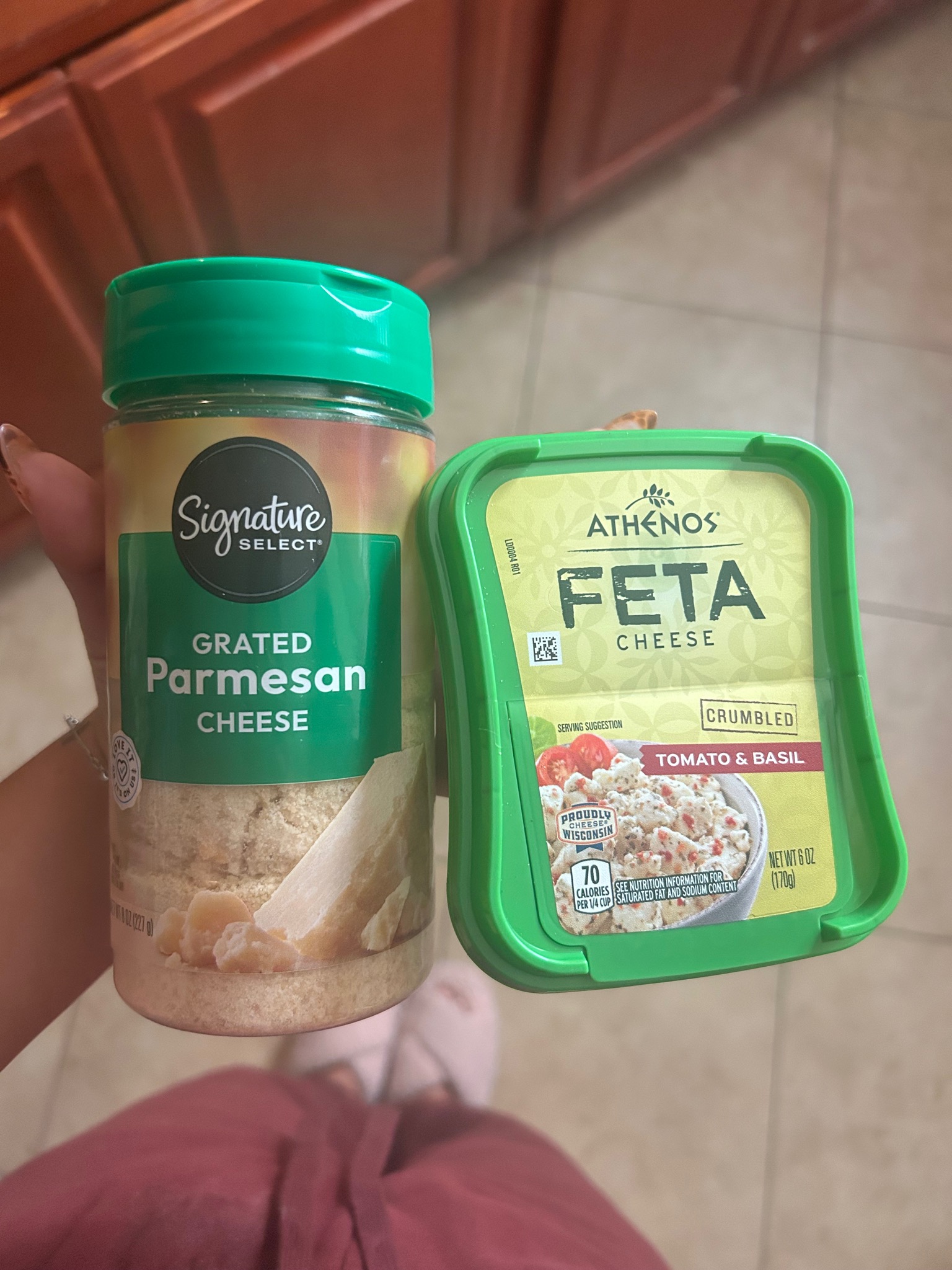 Once all the ingredients are gathered, it’s time to start your prep. Start with boiling your pasta water for around 10 minutes, or until your water reaches a boil. While the water boils, I’ll start cutting my cherry tomatoes in half, and normally I would shred my cheese, but because I was looking for a shortcut, I bought grated feta cheese and parmesan. That being said, nothing tastes better than freshly shredded cheese, so don’t be like me, be better.
