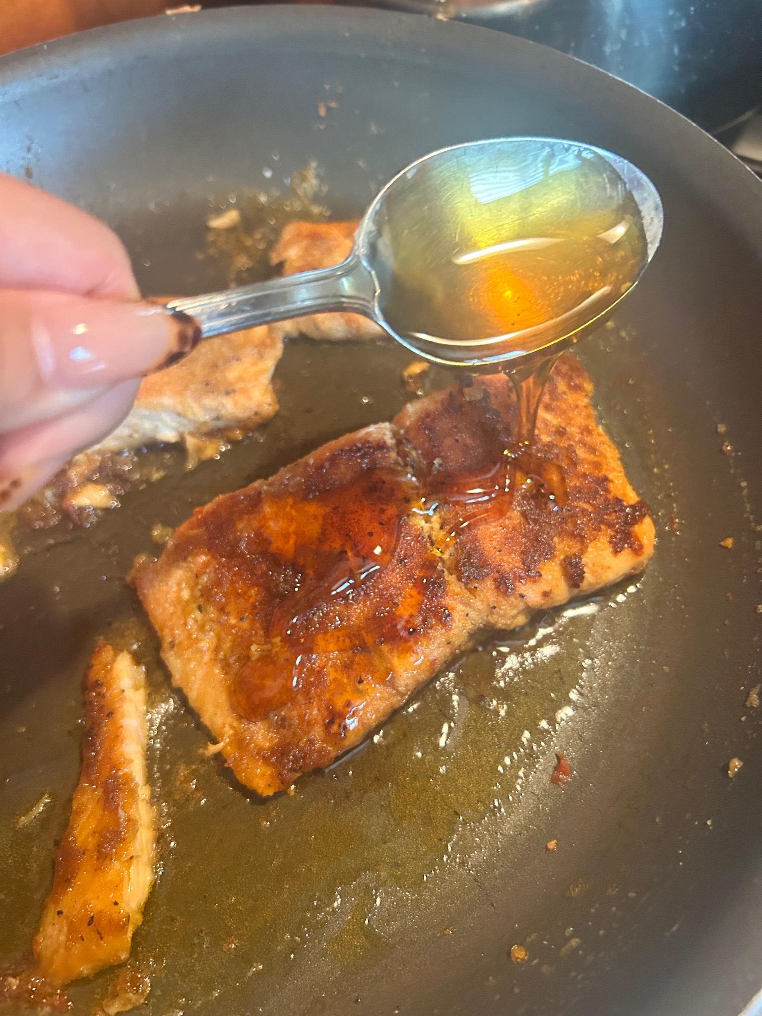 Salmon doesn’t take long to cook. I cook each side of the salmon for about eight to ten minutes each. The good thing about fish, and also red meat, is that you can cook it however you prefer it (rare to well-done). I like my salmon cooked all the way through. I always double check that it is by gently cutting into the middle of the patty to see if it’s pink and juicy inside. Once it fits the description, it’s ready for the final step – the honey.